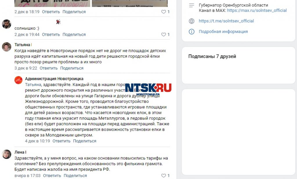 Заголовок и подзаголовок – это сообщение, которое новотройчанка Татьяна разместила на официальной страничке в ВК губернатора Оренбургской области. Ниже размещён ответ администрации Новотроицка: