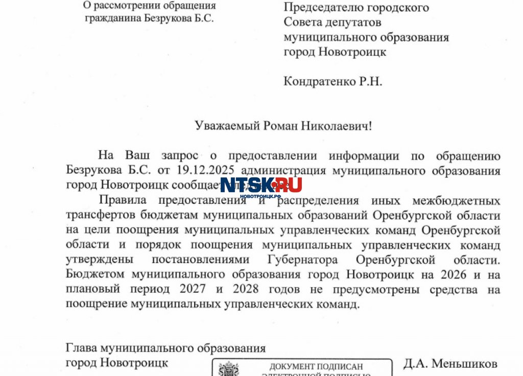 Напомним, в последнем в 2025 году заседании горсовета Новотроицка 7 созыва в разделе «Разное» председатель представительного органа местного самоуправления Роман Кондратенко зачитал обращение (смотрите ВИДЕО) к народным избранникам жителя Новотроицка, действующего участника СВО Богдана Безрукова, который, в частности поинтересовался (цитируем) «Кому и в каких объёмах будет выплачена премия для управляющей команды от губернатора региона в размерах 3 миллионов рублей, и почему бы эту премию не распределить рядовым сотрудникам администрации города?».