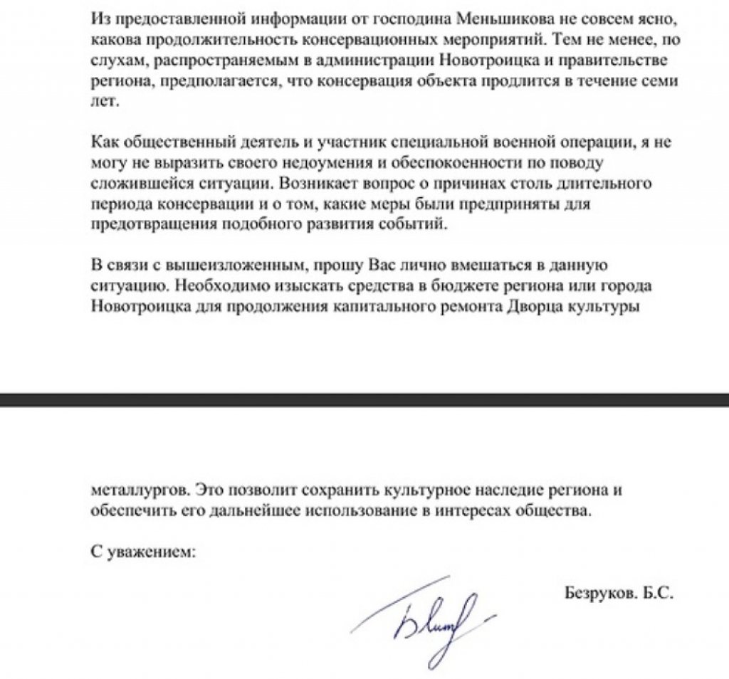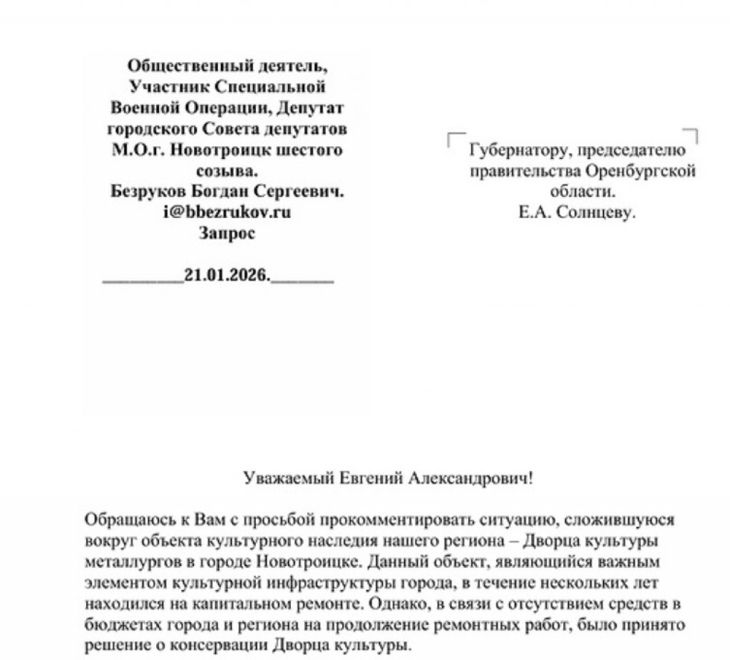 Новотройчанин Богдан Безруков, в настоящее время принимающий участие в СВО, находит время, чтобы отслеживать процессы, которые происходят в его родном городе. Перед вами, уважаемые читатели, его обращение к главе региона Евгению Солнцеву по поводу затянувшегося ремонта здания Дворца культуры металлургов. Приводим его письмо полностью.