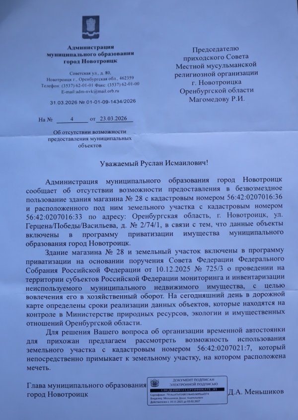 Денис Меньшиков в свой последний рабочий день – это было 31 марта 2026 года – подписал несколько важных документов. Один из них касался давнишней просьбы мусульман города предоставить им для устройства автостоянки земельный участок, находящийся напротив Соборной мечети, на котором вот уже много лет находится заброшенное, полуразрушенное здание бывшего магазина. В тот момент ещё глава Новотроицка отказал правоверным, мотивируя своё решение тем, что данные объекты включены в программу приватизации и будут реализованы на торгах.